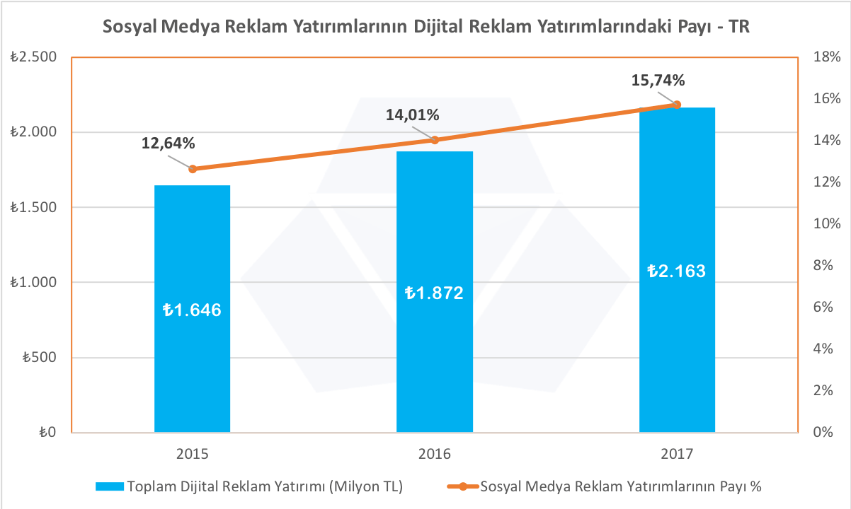 IAB Türkiye’nin her yıl yayınladığı AdEx raporlarına göre 2017 yılında Türkiye, dijital reklamlara 2,16 Milyar TL harcadı. Sosyal medya reklam yatırımlarına ise 2015, 2016 ve 2017'de sırasıyla 208, 262 ve 340 Milyon TL harcandı. Son 3 yılda sosyal medya reklam yatırımları, toplam dijital reklam yatırımlarındaki artışın neredeyse iki katı büyüme gösterirken, yılda ortalama %28 büyüdü. Grafikte de görüldüğü üzere sosyal medya reklam yatırımlarının dijitalden aldığı pay her geçen gün artıyor.